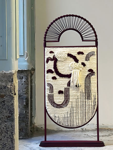 Like a valley, the screen holds layers of depth and texture, translating a sense of landscape into form. At its centre is a woven wool panel where layered natural and coloured yarns with sculptural reliefs create a surface that shifts with light. The multitudes of textures move across the screen almost like terrain, soft and structured resulting in a landscape held within a frame.
